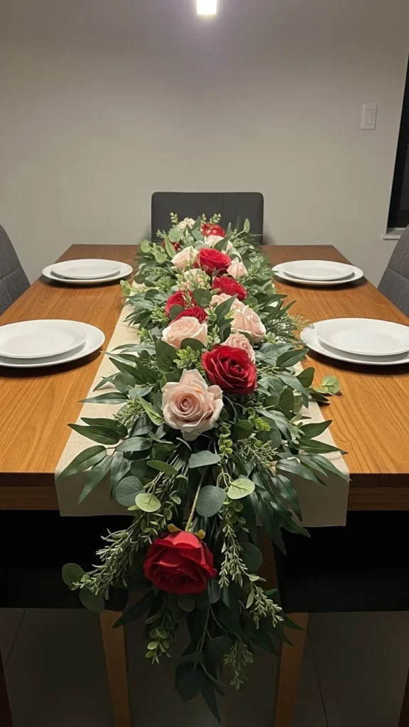A floral garland runner feels romantic and slightly storybook. Use faux flowers so it lasts through multiple meals. Choose flowers with fabric petals instead of plastic for a softer look. Keep greenery loose and uneven so it feels relaxed. If buying a full garland feels expensive, create sections and space them out. Lay them directly on the table or over a neutral runner. This works especially well on wood tables where texture shows through. Keep place settings simple so the runner stands out. White napkins and plain dishes are enough. Greenery down the center draws the eye without overwhelming the table. After Valentine’s Day, remove the roses and keep the greenery for everyday use. Store flowers flat to keep their shape.