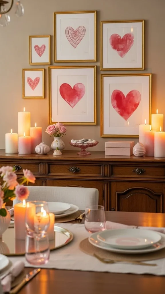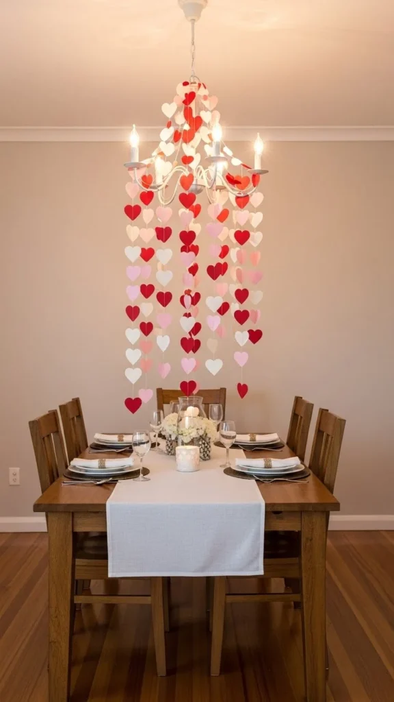 Paper hearts hanging from a chandelier feel playful and light. Use cardstock or recycled paper. Keep strings uneven for movement. Choose two or three colors max. This decor floats above the table, saving surface space. Vertical decor works well in small dining rooms. After the holiday, trim the strings shorter and keep neutral hearts for everyday use. Easy, affordable, and removable.