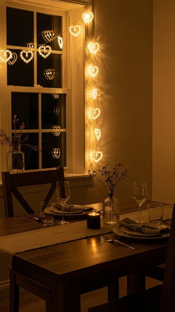 Heart string lights bring gentle glow without taking table space. Choose warm white light for comfort. Drape them along a window, shelf, or wall edge. Low, warm lighting sets the mood naturally. Battery-powered options keep cords hidden. Avoid flashing modes for dining spaces. After the holiday, remove the heart covers and keep the lights for everyday use. This detail works especially well for evening meals and small gatherings.