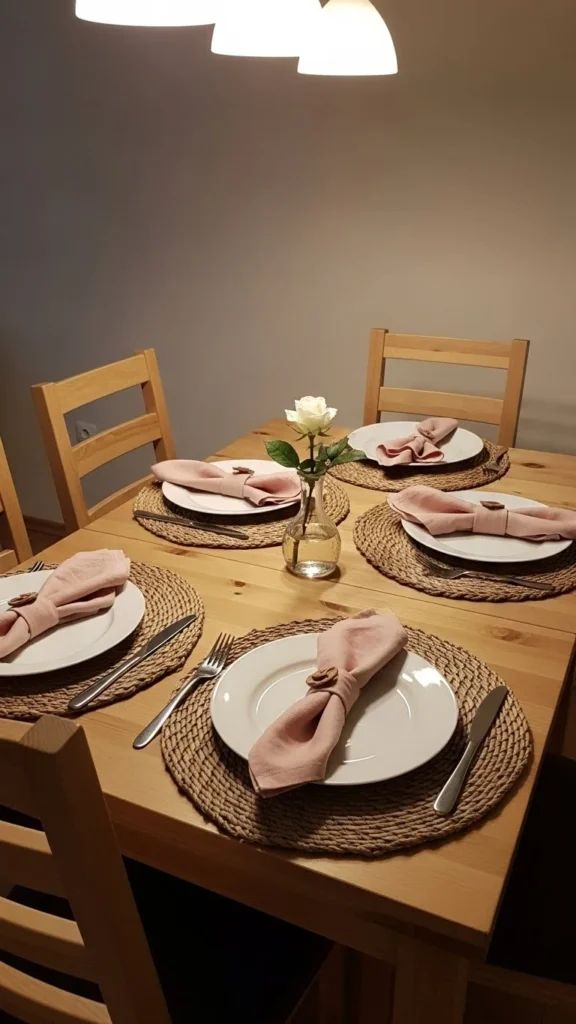 Heart-shaped placemats bring themes without being too obvious. Woven materials like jute or rattan keep things grounded. Stick to natural tones so they blend with everyday pieces. These work especially well on light wood tables. If buying feels costly, cut heart shapes from cork placemats or felt. Keep plates centered so the heart shape stays visible. Texture does the talking here. Avoid patterned dishes so the placemats shine. After Valentine’s Day, stack them as wall decor or use them under plants. Dual-purpose pieces always feel smart.