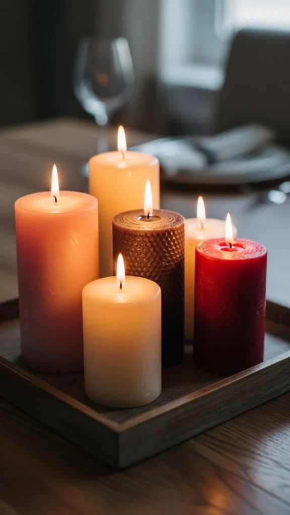 A tray keeps decor contained. Mix candles and small accents. Stick to one color story. Contained styling avoids clutter. Easy to remove after dinner.