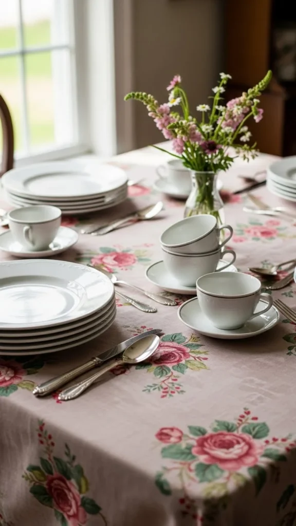 A floral tablecloth sets the tone instantly. Look for faded patterns instead of bold prints. Linen blends drape nicely and feel relaxed. If a full cloth feels too much, use it only for dinner and remove afterward. Soft florals feel romantic without shouting theme. Washable fabrics make cleanup stress-free. Fold and store for next year.