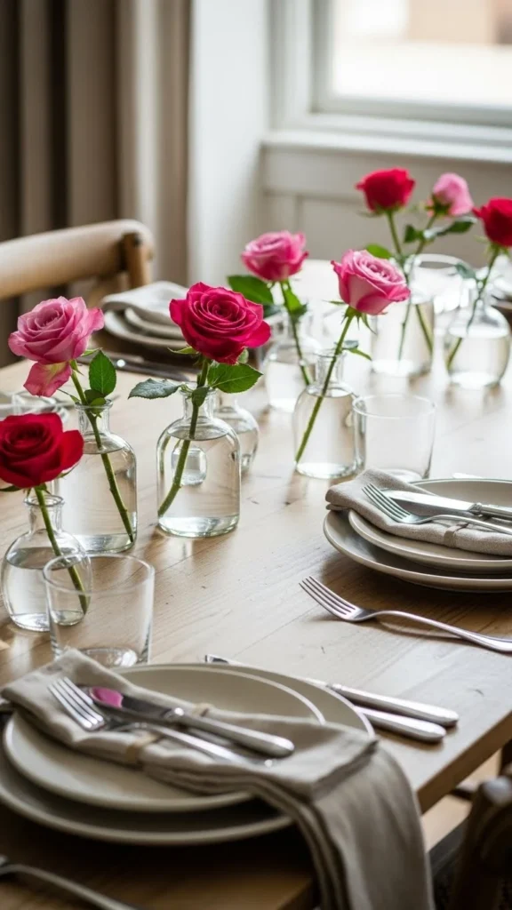 Single-stem roses feel thoughtful and simple. Use multiple small vases instead of one large arrangement. This keeps sightlines clear across the table. Clear glass blends easily with any decor. Less flowers, more impact when spaced out. After dinner, move them around the house. Budget-friendly and flexible.