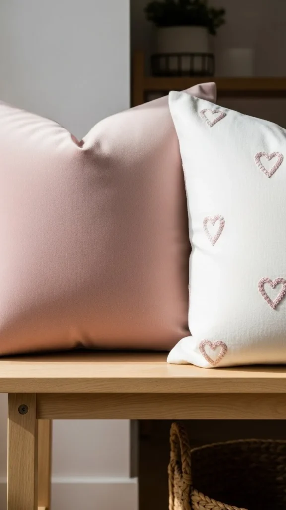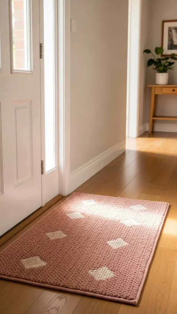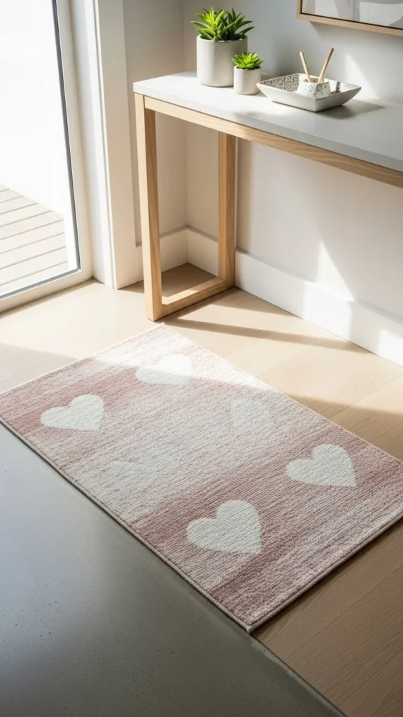 A blush welcome mat sets the tone the moment someone steps inside. Choose a woven design so the texture adds gentle warmth. Patterns should be subtle to keep the look calm. You can find affordable mats online or stencil your own using outdoor paint and a heart template. Pair the mat with a clean entry bench or umbrella stand to maintain flow. Keep the surrounding area tidy so the mat stands out without clutter. If your flooring is dark, the soft pink adds a light contrast that feels uplifting. Consider layering a neutral rug underneath for a cozy, grounded effect. This simple change brings a quiet Valentine charm in seconds and works well for both modern apartments and family homes.