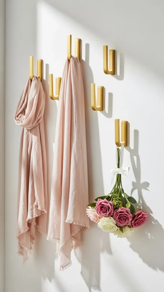 Wall hooks can be both functional and decorative. Add a scarf in a soft pink tone, and hang a small floral bundle beside it. Gold hooks add a gentle warmth that suits Valentine styling. Keep the arrangement simple to avoid visual clutter. This is a practical way to add décor without taking up floor space. If you want variety, switch the floral bundle weekly or change ribbon colors. It’s a subtle, sweet touch that complements any entry setup.