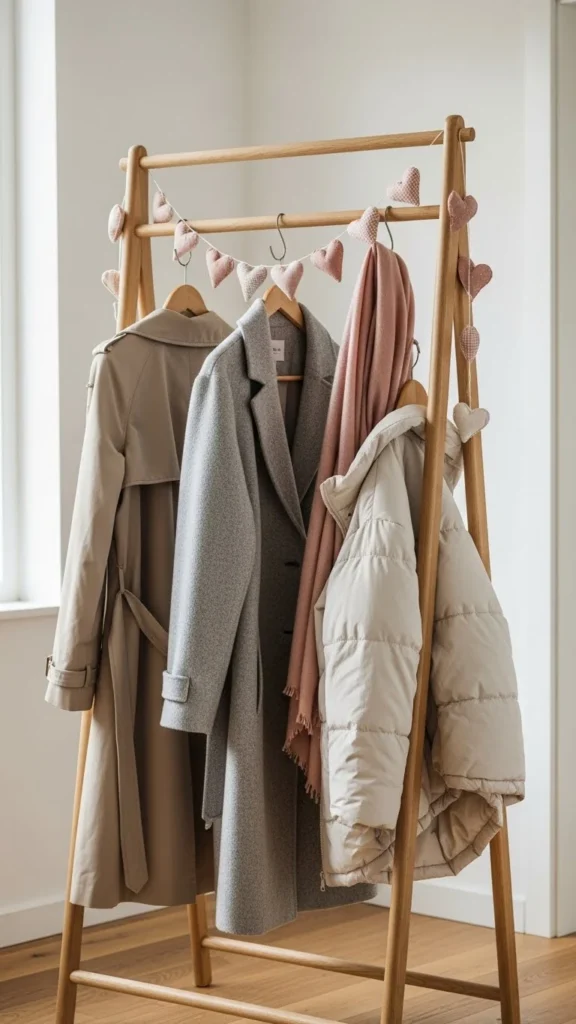 A coat rack is often overlooked as a décor opportunity. Drape a heart garland across the top bar for a seasonal accent. Keep the garland lightweight so it doesn’t interfere with daily use. Pair the look with a blush-toned coat or scarf to tie the palette together. You can make the garland using cardstock or felt for a low-cost DIY. This detail brings charm without adding clutter, perfect for narrow entryways.