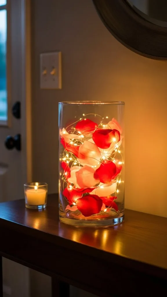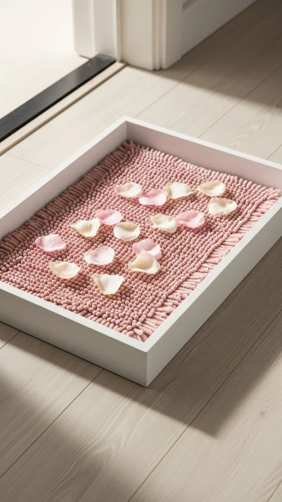 A shoe tray doesn’t have to feel purely functional. Add a blush mat inside to soften the look and sprinkle a few faux petals for a gentle Valentine touch. Keep the petals minimal so the tray remains practical. This small update pairs well with neutral flooring and helps define the entry visually. It’s an inexpensive idea that brings charm without effort. You can even swap the blush mat for other seasonal colors later.