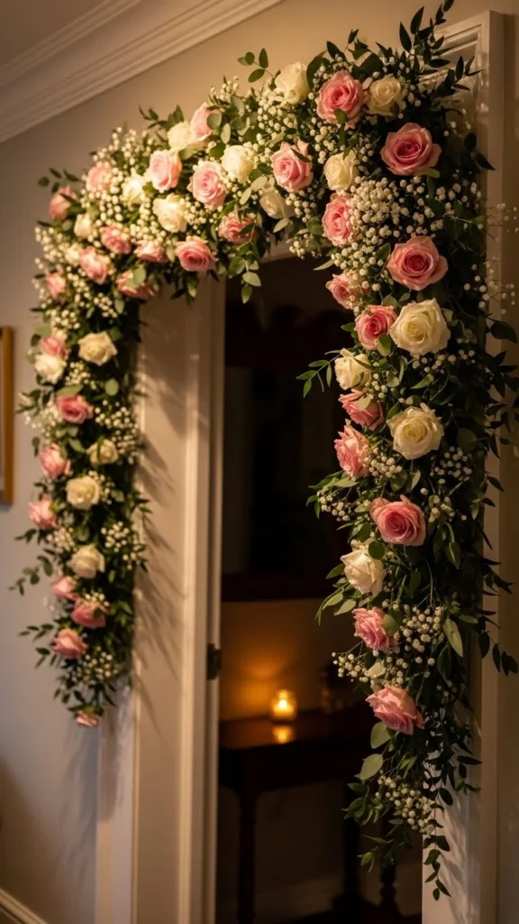 Soft florals around the doorway invite guests in with a warm touch. Use lightweight garlands so the look feels gentle rather than heavy. Choose soft pink and white blooms for a relaxed Valentine aesthetic. Attach the garland using removable adhesive hooks. Keep the rest of the entry subtle so the doorway becomes the highlight. You can reuse the garland for spring décor, making this an eco-friendly and budget-friendly choice.