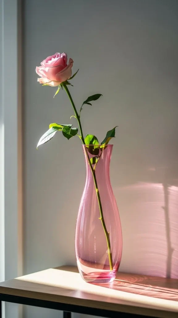 Sometimes a single stem can make a stronger impression than a full bouquet. Use a colored glass vase for an extra hint of charm. A single rose, tulip, or carnation works beautifully. Place the vase off-center on your console and pair it with a small bowl or candle. This look is affordable and easy to refresh weekly. It brings a quiet romantic detail into the entry without taking space.