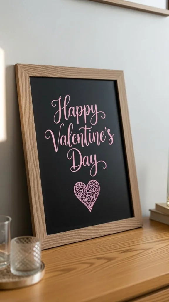 A mini chalkboard lets you share a friendly Valentine message right at the door. Choose a simple frame so the handwriting becomes the star. Use pink or white chalk to keep the look soft. Write short phrases that welcome guests kindly. Chalkboards are inexpensive and easy to update year-round. Pair it with candles or a small vase for balance. This adds a personal touch that feels warm and thoughtful.
