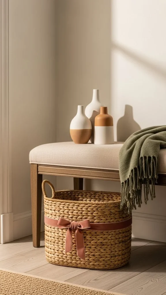 A basket is both functional and pretty when styled with ribbon. Tie a velvet bow around the top edge and keep the rest simple. Use the basket for shoes, scarves, or mail. The ribbon instantly introduces Valentine color while keeping storage hidden. This is a fun trick if you prefer décor that blends with everyday items. It works for any size entry and is extremely budget-friendly.