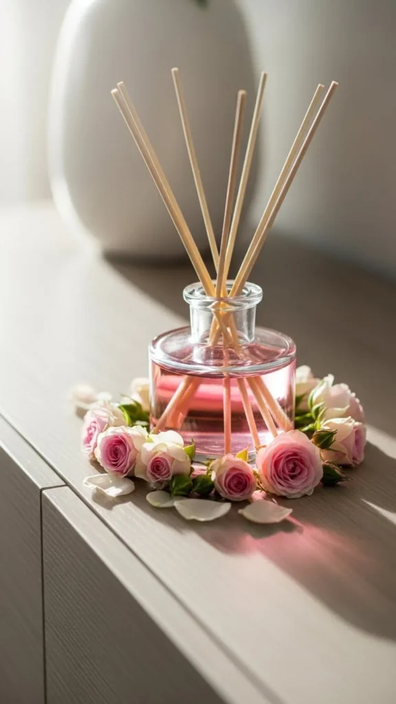 A reed diffuser greets guests with a subtle fragrance. Choose a light floral scent for a romantic atmosphere. Pink-toned liquid or tinted glass adds a seasonal touch. Place the diffuser on a tray so the area feels styled. You can add a few dried rosebuds or petals around it for detail. This setup is easy to maintain and doesn’t take up space.