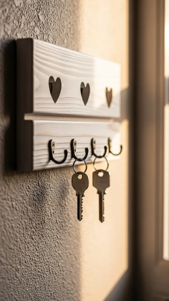 A key holder is perfect for adding charm without taking up room. Look for designs with small heart carvings or add decals to a plain holder. Mount it near the door for daily convenience. Keep keys organized so the décor looks intentional. This is an easy DIY using a scrap piece of wood and a set of hooks. The small heart detail adds a sweet seasonal touch while keeping the entry tidy.