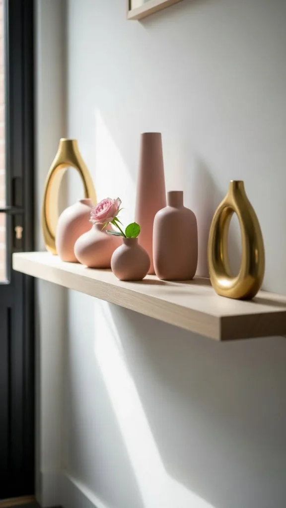 A floating shelf is a simple way to introduce Valentine charm without taking floor space. Keep the décor light so the shelf doesn’t feel crowded. A small bud vase, a blush ceramic bowl, or a gold trinket adds enough romantic detail. Stick to two or three items and vary their heights for balance. You can swap pieces seasonally, making this an easy year-round styling trick. If you’re on a budget, spray-paint old accessories in soft pink or muted gold. The shelf becomes a sweet visual pause in the entry, drawing just enough attention without overwhelming the room. This idea works well in compact spaces and provides subtle character the moment guests walk in.