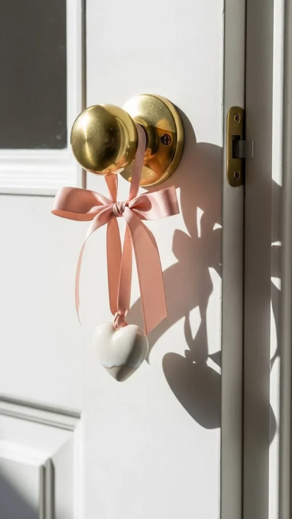 A doorknob charm adds a soft, romantic touch in the most unexpected spot. Choose a small heart-shaped charm or create one using air-dry clay. Tie it with blush or ivory ribbon for a calm, elegant look. This detail is quick to install and perfect for renters. It also suits minimalists who want something subtle rather than a full wreath. Swap colors or charms later for other holidays. Keeping accessories small ensures the entry remains functional, especially in tight spaces. This tiny gesture feels thoughtful and welcoming without needing any major updates. It’s a sweet finishing touch that brings a bit of Valentine personality right at eye level.