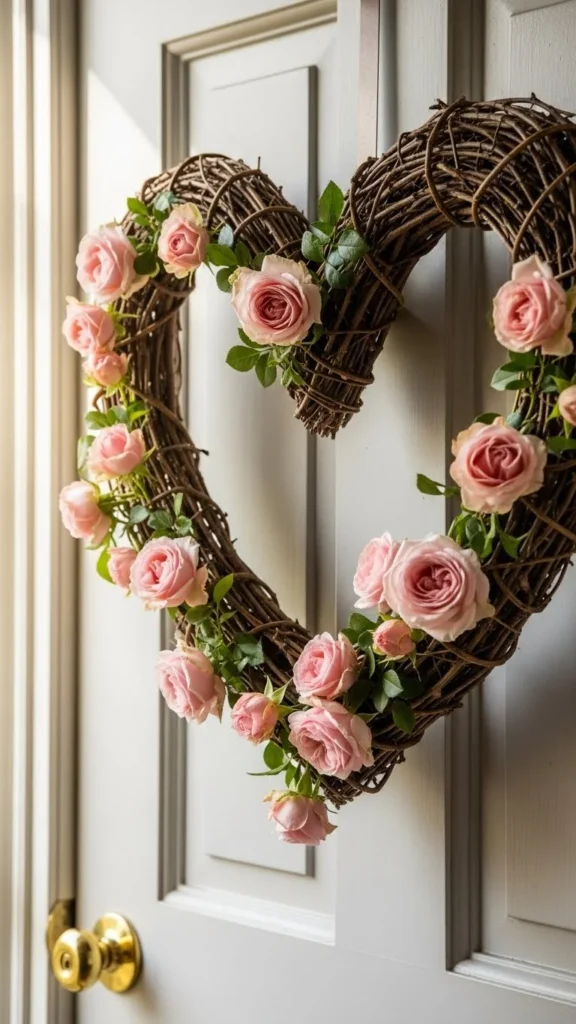 A heart wreath instantly signals the spirit of Valentine’s Day. Use a branch-style base for organic charm and add blush roses for a soft romantic touch. Lightweight faux florals work well and last for years. Hang the wreath with a silk ribbon that matches your color palette. You can also create your own wreath using flexible twigs and floral wire. This décor idea looks beautiful against both dark and light doors. Keep the surroundings simple so the wreath becomes the focal point. It’s an easy, timeless choice that welcomes visitors with gentle charm.