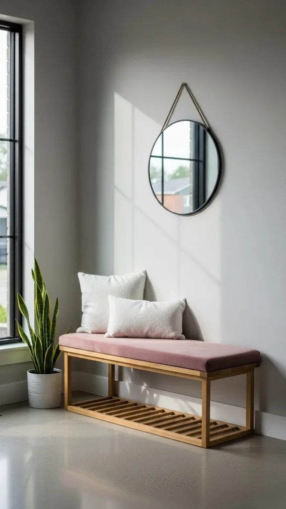 A cushioned bench adds comfort and seasonal personality without much work. Choose velvet or faux suede for a smooth texture that feels cozy. Soft pink pairs well with neutral walls and wood floors. Add a couple of white throw pillows for contrast. You can DIY a cushion cover using affordable fabric and basic sewing skills. This is a great way to update your entryway seasonally without changing furniture. Keep shoes and extra items neatly stored below to maintain a clean look. The cushion softens the space and introduces warmth as soon as you walk in.