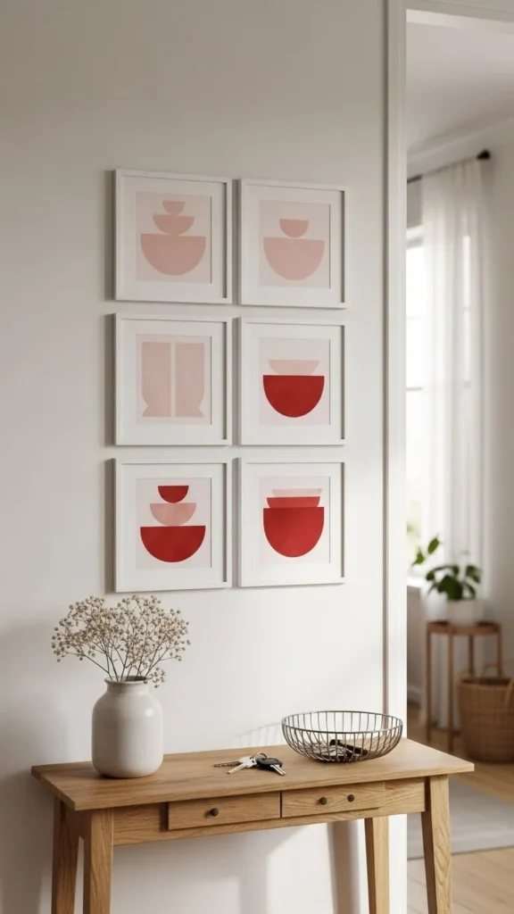 A mini gallery wall gives your entry personality and a sweet seasonal twist. Choose small prints featuring hearts, soft watercolor strokes, or short romantic phrases. Keep frames slim and neutral so the artwork stands out. Arrange them in a simple grid or a relaxed stagger. You can print the art at home to keep costs low. Use removable hooks if you’re renting. Pair the gallery with a few small décor accents on the console below. This is a fun way to bring color into a narrow space without overwhelming it.