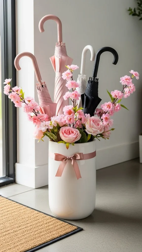 Your umbrella stand can double as a décor accent when styled thoughtfully. Add a soft ribbon around the stand and tuck a few faux blossoms inside alongside your umbrellas. This adds a romantic detail without taking up extra space. Choose blossoms like peonies or roses for gentle texture. This idea is ideal for small entryways since it uses an existing functional item. If your stand looks too plain, paint subtle pink strokes or add peel-and-stick decals. The goal is a soft seasonal accent that feels charming but still practical.