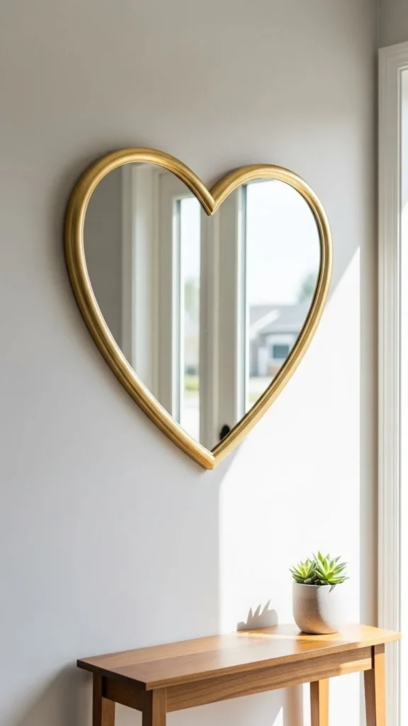 Mirrors open up tight spaces, and a heart-shaped frame adds a festive detail. A gold finish creates warmth and pairs nicely with soft Valentine tones. Hang the mirror at eye level so it feels natural in the entry. Keep the surrounding décor simple so the shape stands out. If buying a new mirror feels expensive, consider applying a removable gold frame sticker to an existing round mirror. This is a great way to update the look temporarily. The reflection helps brighten your entry and adds a subtle romantic flair.