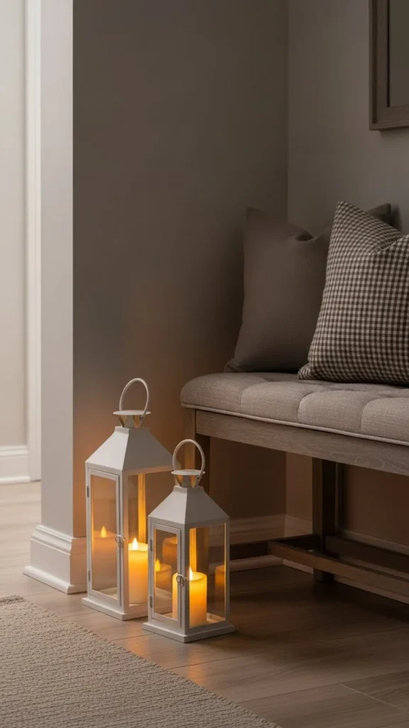 Lanterns bring a calm presence to your entry space. Use matte white or brushed metal designs for a soft, romantic tone. LED candles offer a warm glow and are safe to use near doorways. Place lanterns symmetrically on either side of the bench or console. You can even tie a small pink ribbon on the handles for a Valentine touch. These lanterns make evenings feel calm and inviting. For a budget option, update old lanterns with a coat of matte spray paint. This little styling trick adds warm atmosphere to your entry.