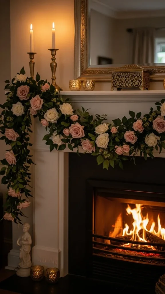 A rose garland sets an instant romantic tone without overwhelming the space. Choose soft blush shades paired with creamy whites for a gentle look. Let the garland drape naturally so it sweeps across the mantel with ease. Add candles or gold accents to complement the floral texture. Faux garlands work beautifully and last for years. To make your own, thread faux stems through a flexible vine base and secure with floral wire. This gives you a custom color mix while keeping costs low. Style it loosely and let a few blooms fall forward for a more relaxed mood. Soft florals pair perfectly with a glowing fire.