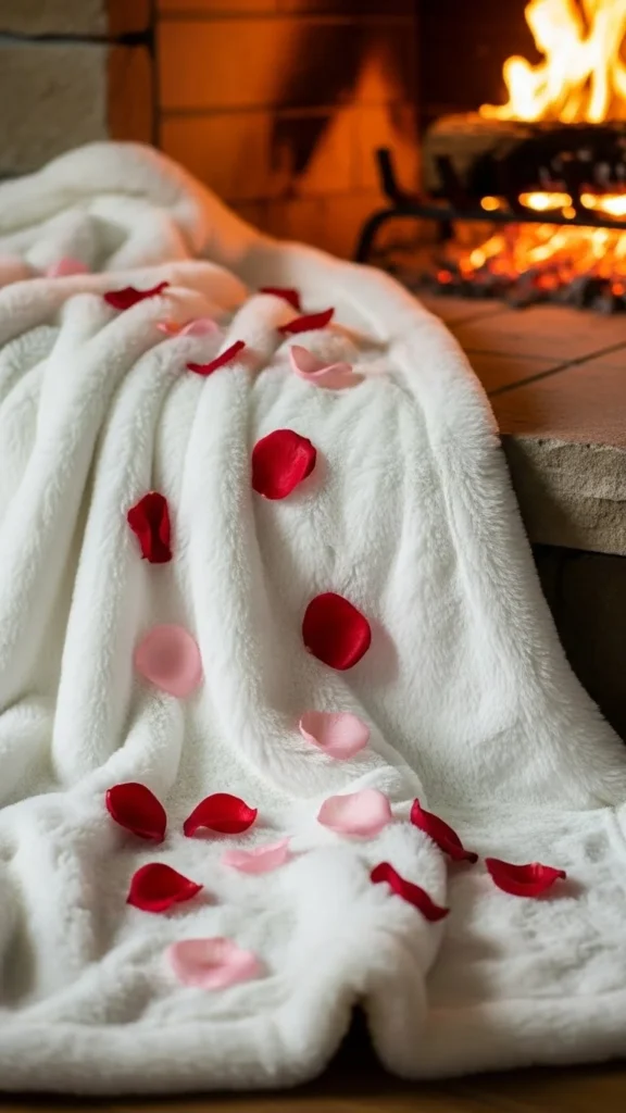 A faux fur throw brings comfort and softness to the fireplace area. It makes the space feel inviting and warm. Place it on the floor near the hearth or drape it over a small stool. Add a few petals or a heart pillow for a gentle Valentine hint. Faux fur is washable and affordable. Choose white or cream to keep the look calm. This setup is perfect for relaxing evenings by the fire.