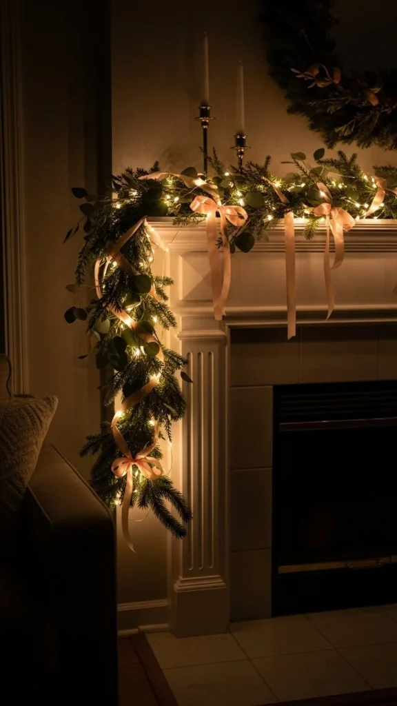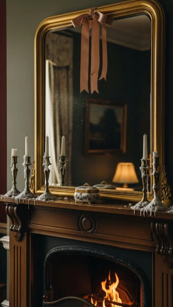 A vintage mirror helps bounce warm firelight throughout the room. Adding a simple satin ribbon gives it seasonal charm. Choose a blush or rose shade that matches the rest of your décor. Hang it securely and let the ribbon drape casually for a soft touch. If you already own a mirror, update it with removable gold rub-on paint for a warmer tone. Keep accessories around it minimal so the ribbon stands out.