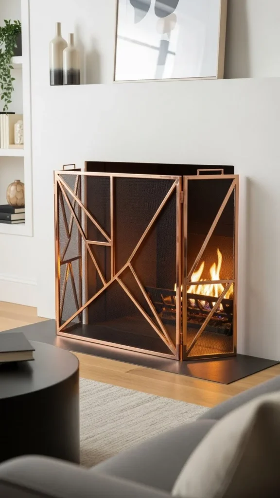 A rose-gold screen adds shine and subtle romance to your fireplace. It reflects the firelight beautifully. Choose a geometric design if you like modern décor. Clean the metal regularly so the glow stays warm. If you want a budget-friendly option, spray-paint an older screen using high-heat metallic paint. Keep the surrounding décor neutral so the screen becomes the star.