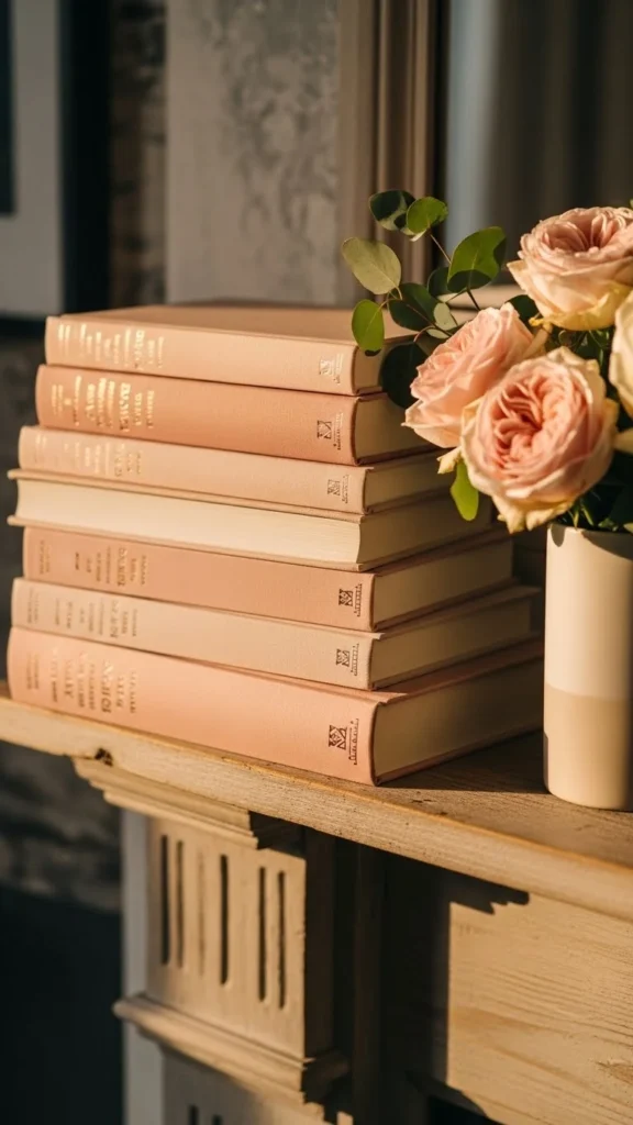 Books can add warmth and height to a mantel display. Choose covers that suit your Valentine palette. Stack a few horizontally and stand a couple vertically for variation. Add a tiny vase of roses for softness. This setup feels thoughtful and collected. If you want to save money, remove dust jackets from books you already own and face the pages outward for a neutral look.