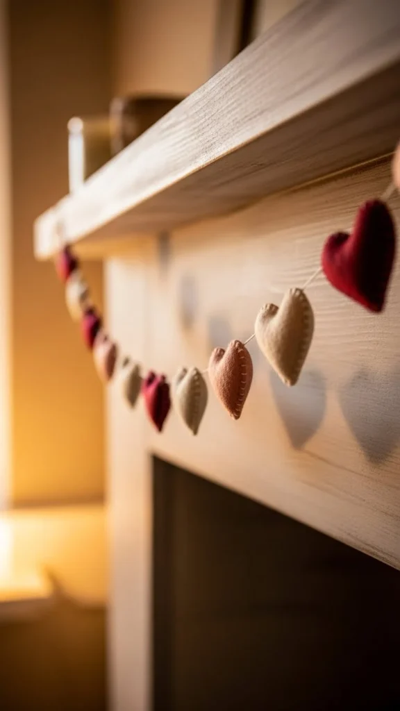 A mini garland works great if you want something subtle. Felt hearts add texture and warmth. Hang it beneath the mantel so it frames the fireplace opening. Choose colors that complement your existing décor. Make your own by cutting felt hearts and threading them onto twine. Leave a little space between each heart so the garland has movement.