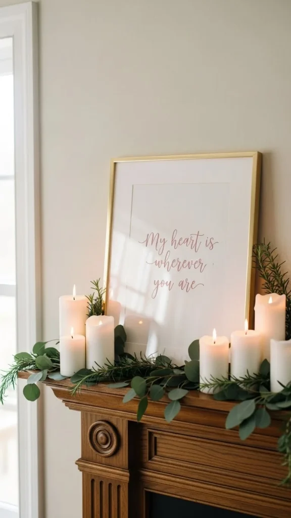 A framed love quote adds meaning to your décor. Choose a simple design so it blends into your mantel arrangement. Gold frames catch gentle firelight and look elegant. Place it in the center or lean it slightly for a relaxed layout. Print your own quote using blush-toned ink to save money. Pair with greenery or roses to round out the look.