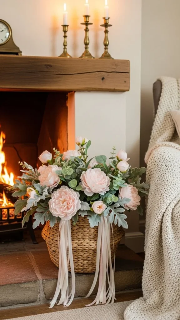 A floral basket beside the fireplace adds gentle color without overwhelming the room. Choose a woven basket for texture and fill it with blush peonies or roses. Mix in greenery to keep the arrangement soft. Let a few ribbon tails spill over the sides for added charm. This is easy to DIY—just gather faux florals and position them so the basket looks full. If you want a budget method, place crumpled paper inside the basket and arrange flowers only on the top layer. Keep the basket slightly angled toward the fire for a cozy look. Soft florals paired with warm light create a welcoming tone perfect for Valentine evenings.