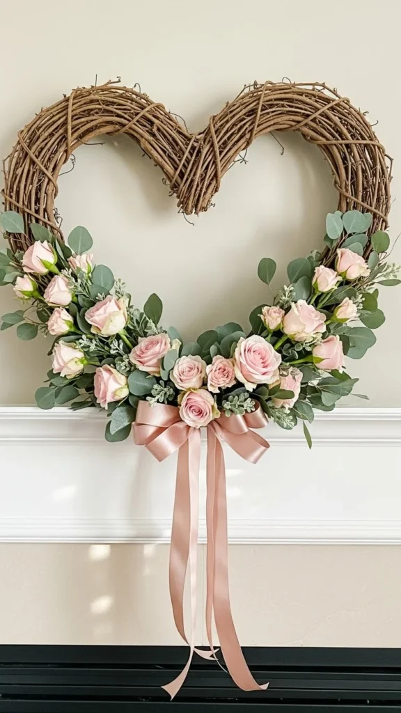A heart wreath brings charm to your mantel without feeling too bold. Grapevine bases add texture and structure. Add blush florals or eucalyptus for softness. Tie a silk ribbon at the bottom for gentle movement. This works well with both classic and modern spaces. For a budget option, build your own wreath using a heart-shaped wire form and affordable faux stems. Keep the arrangement airy so the wreath stands out instead of feeling heavy.