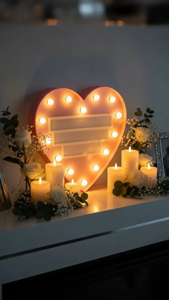 A glowing heart marquee sign is a fun way to bring seasonal charm to your fireplace. Look for models with warm LED bulbs so the glow feels gentle. Style it with a few florals or candles for a romantic arrangement. Battery-powered signs allow flexible placement. If you like crafting, make your own using foam board, string lights, and metallic paint. Keep the rest of the mantel simple so the heart stays the focal point.