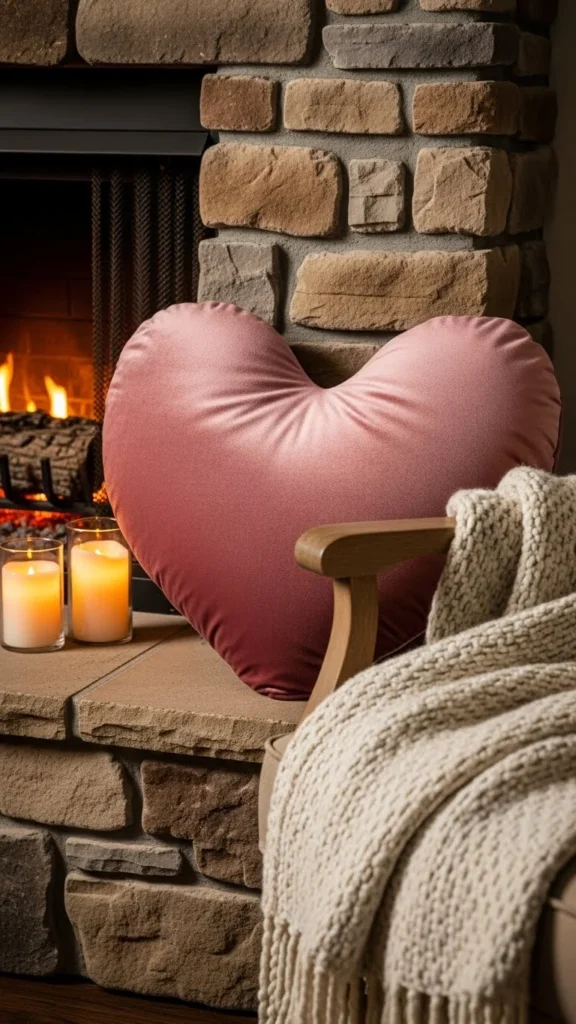 A heart pillow adds just enough charm to the hearth. Velvet looks rich and soft—perfect for Valentine décor. Choose deep tones like wine or rose for depth. Pair with a neutral throw to balance the color. This is an easy item to sew yourself using leftover fabric and stuffing. Place the pillow slightly angled for a relaxed look. It’s a cozy detail that warms up the entire fireplace area.