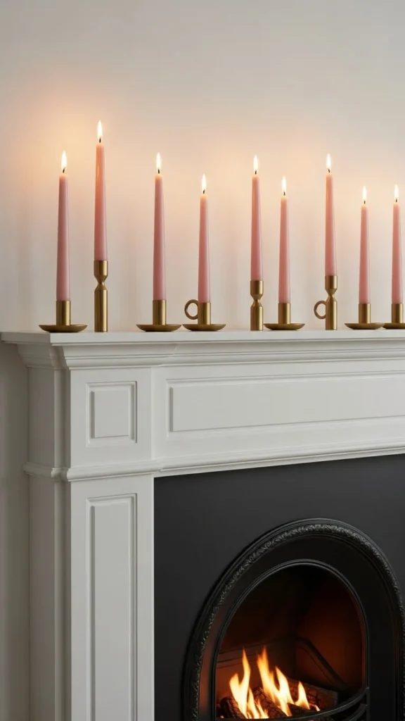 Taper candles bring height and grace to your fireplace décor. Pair blush candles with gold holders for warmth. Spread them along the mantel at varying heights. You can add a few sprigs of greenery for contrast. If you want an affordable option, spray-paint old candleholders in matte gold. Use dripless candles to keep the mantel tidy. The soft glow creates a gentle, romantic atmosphere.