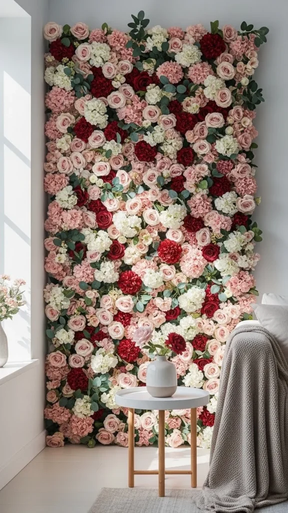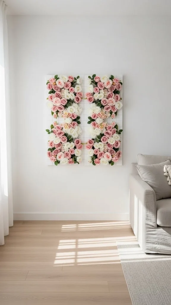 For renters, command hooks or removable strips save paint. If you want depth, tuck faux greenery behind a few blooms. Keep the surrounding decor simple. A neutral sofa or bench lets the wall stand out. Budget tip: mix dollar-store roses with higher-quality florals only in the center area. Cameras focus there first.