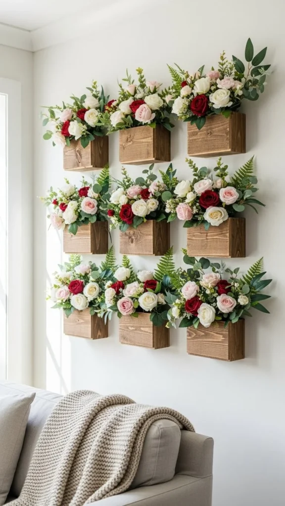 Wall flower boxes add depth and structure. Use shallow boxes so they don’t cast heavy shadows. Fill with mixed florals and greenery. Keep colors balanced.