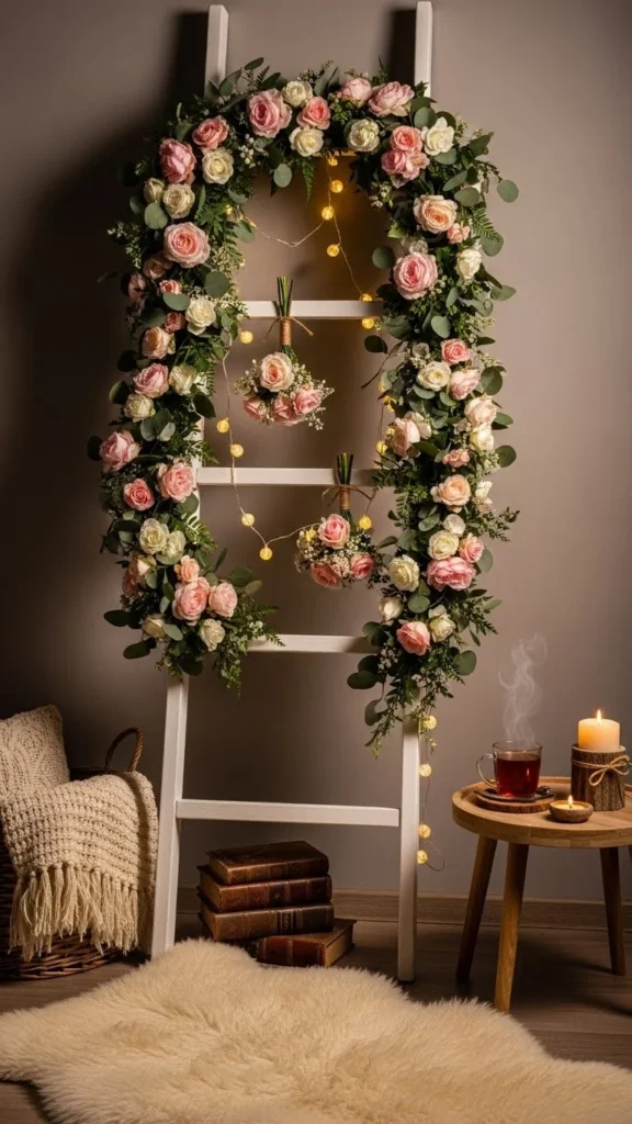 Keep the garland slim. Thick florals can overwhelm narrow spaces. Soft pinks and whites work well with most interiors. This setup feels dynamic because of the natural upward line.