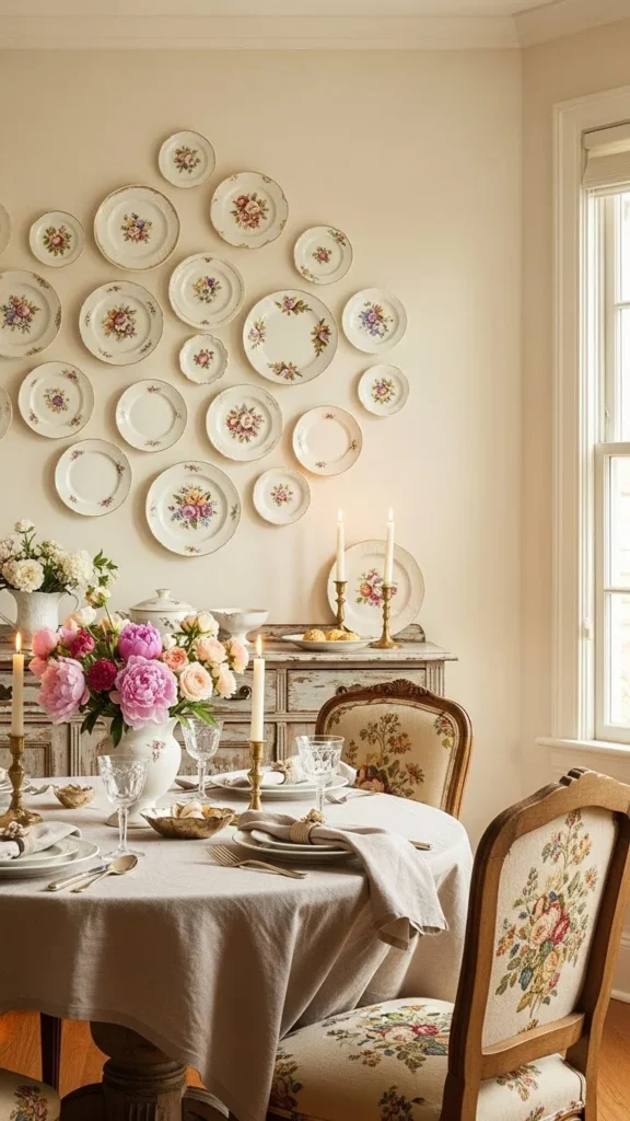 Floral plates feel charming and nostalgic. Use plate hangers for safety. Mix patterns but keep colors aligned. This adds character without fabric or flowers.