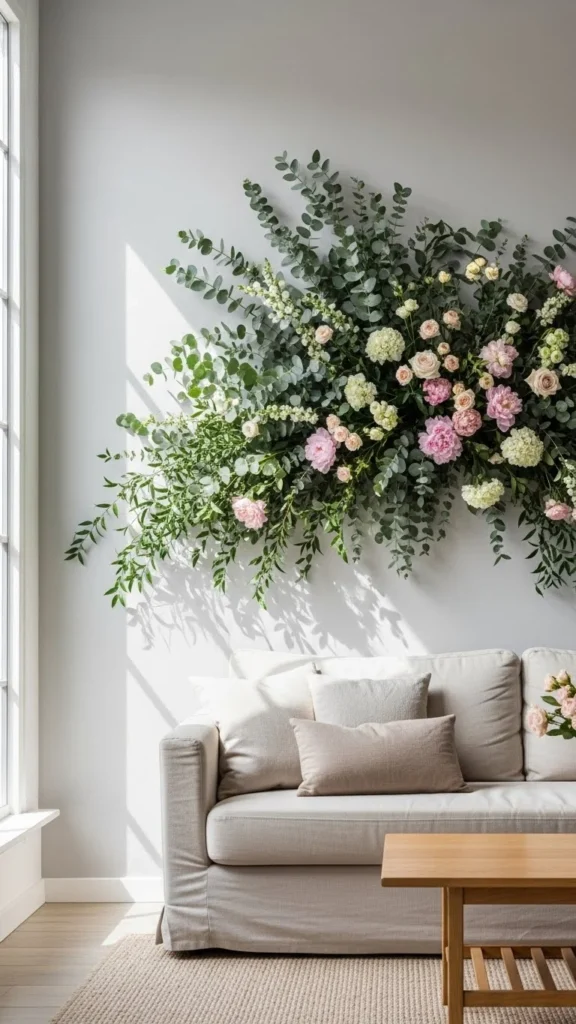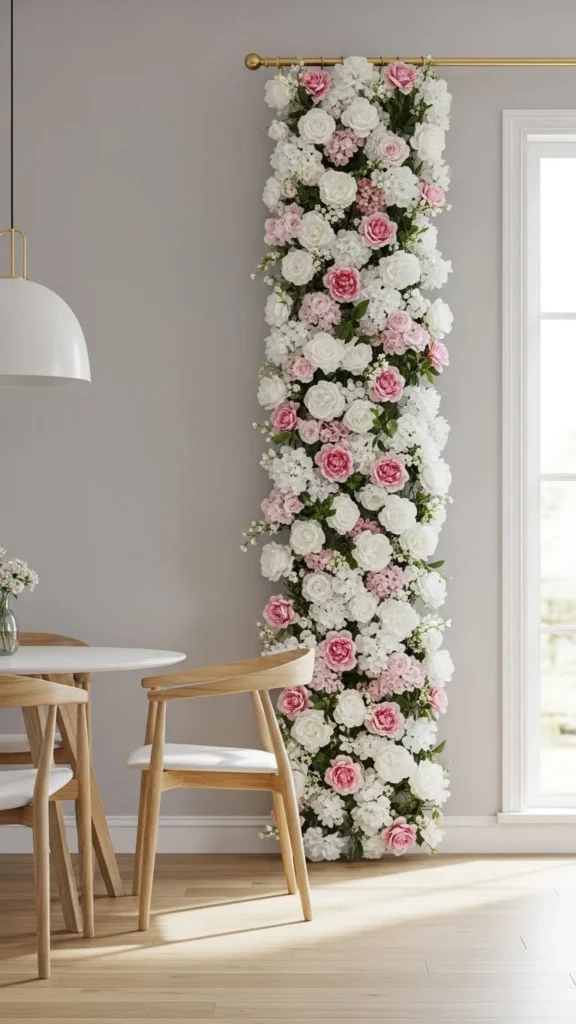 This idea works great for dining corners or empty walls. For a budget setup, mix greenery vines with only a few floral strands. Keep heavier blooms near eye level. If walls are delicate, use ceiling hooks or tension rods.