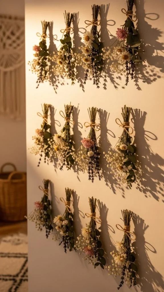 Dried flowers bring texture and softness. Use command hooks. Keep spacing even. Earthy tones photograph warmly.