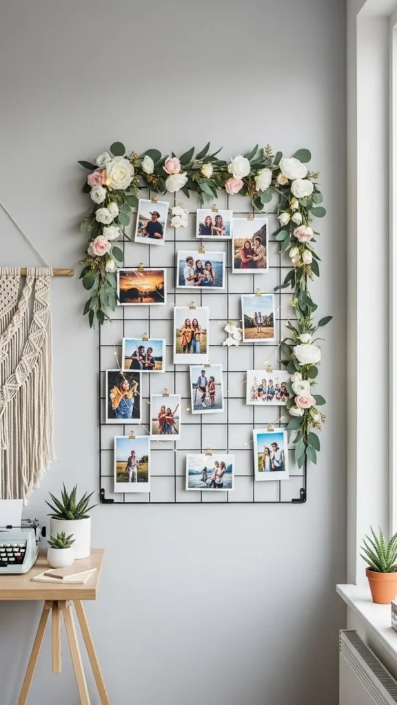 Wall grids offer flexibility. Clip garlands loosely. Add a few photos for personality. Keep balance between decor and empty space.