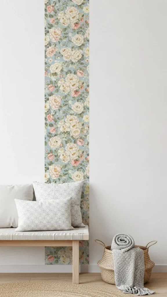 A single wallpaper strip makes an impact without full coverage. Choose soft prints. Center it for symmetry.