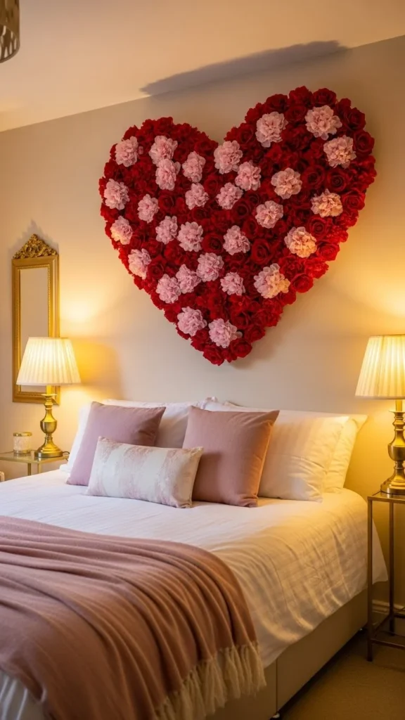 A floral heart wall turns a plain bedroom into a romantic photo spot. Cut the heart shape from foam board or cardboard. Outline first with darker flowers, then fill the center with lighter shades. This adds contrast on camera. Silk flowers hold up well and stay reusable.