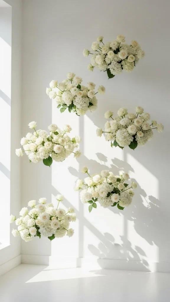 Floating floral clusters feel dreamy. Use lightweight faux flowers. Mount carefully so hardware stays hidden.
