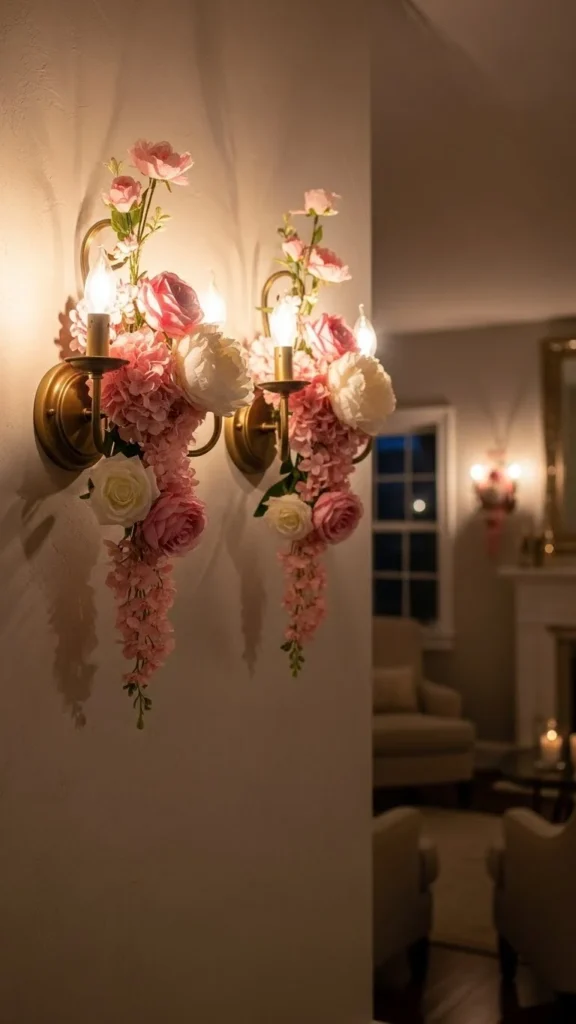 Floral wall sconces create soft glowing photo corners without taking over the room. Start with simple plug-in or battery sconces. Wrap faux flowers loosely around the base, not the bulb. This keeps light clean and faces well-lit. Choose neutral flower tones so skin tones look natural in photos.