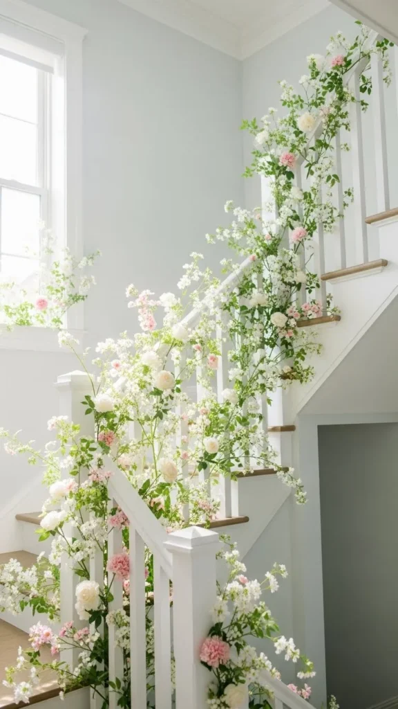 Staircase walls are often ignored but photograph extremely well. Run floral garlands along the stair angle. Secure lightly with removable hooks. Use greenery as a base and add flowers every few inches.