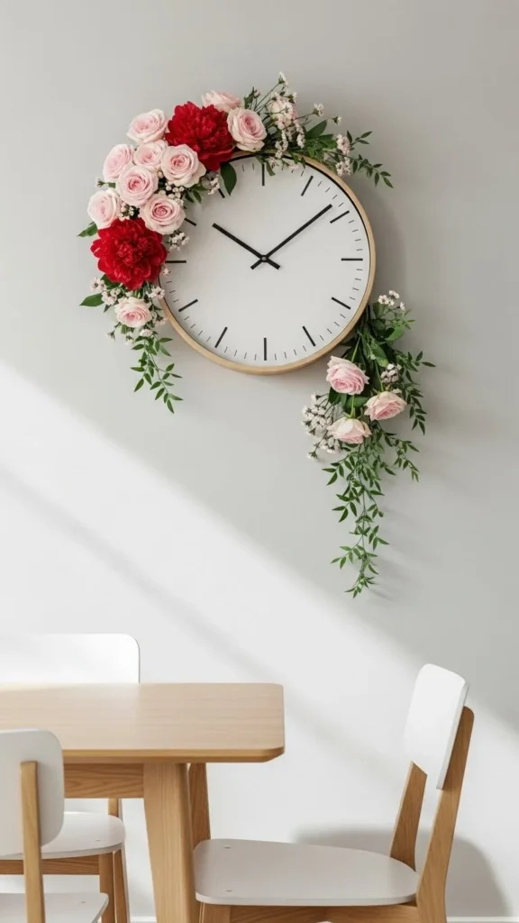 A floral-framed wall clock blends function with romance. Use a simple clock design and add florals around the outer edge only. Keep the face clear so the shape stays visible in photos.